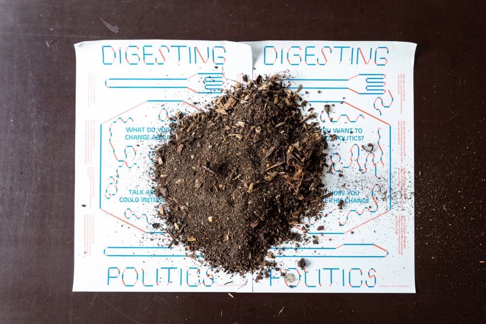 Company Drinks ran Digesting Politics lunches, organised by Cam Jarvis, between 2017 and 2019. The photo shows the table mat designed by Europa. The compost on top is from the Company Drinks Grow Club, run by Shaun Tuck, and was collected between 2017 and 2020.